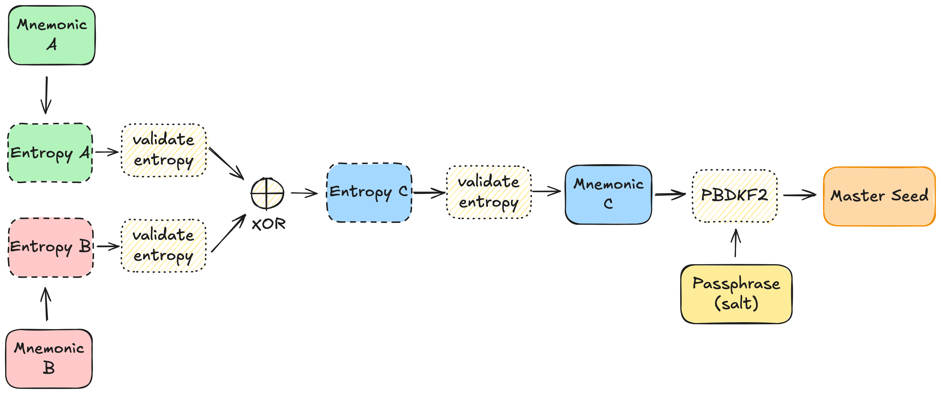 - Obtain two different mnemonics (A and B) and extract their entropy bytes.